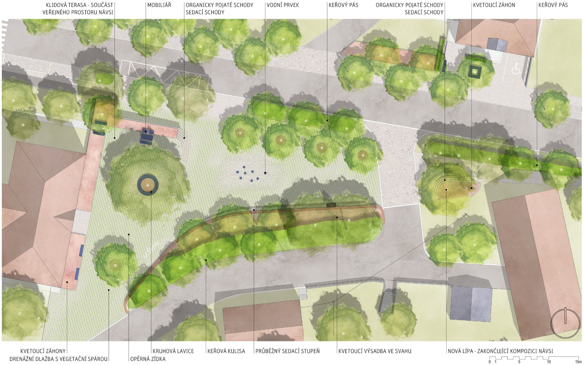 Stávající pomník je nově situován mezi dvě vzrostlé stávající lípy, které mu dodají adekvátní doprovodnou kulisu. Nad zpevněnou plochou návsi se dále nachází stávající zatravněný svah se vzrostlými stromy. V návrhu je doplněn novou výsadbou stromů, keřovou kulisou podél jižní hranice a trávník je nahrazen půdopokryvnými výsadbami trvalek. Pata svahu je podtržena opěrnou zídkou z kamene s korunou z pálených cihel.
